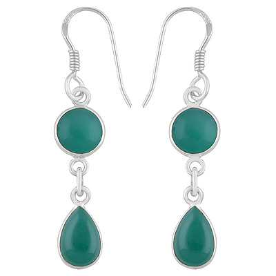 Home | Silver Earrings | Cabochon Earrings | Alluring Two Stone Green Onyx Round/Pear Shape 925 Sterling Solid Silver Dangle Earrings