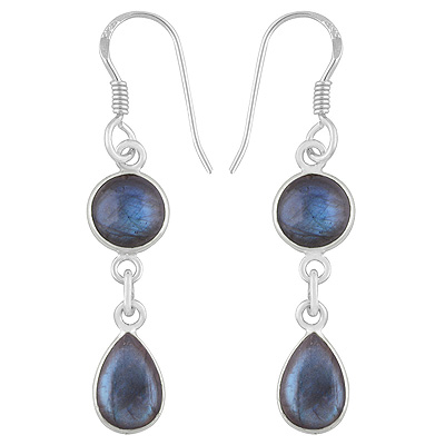 Home | Silver Earrings | Cabochon Earrings | Alluring Two Stone Labradorite Round/Pear Shape 925 Sterling Solid Silver Dangle Earrings