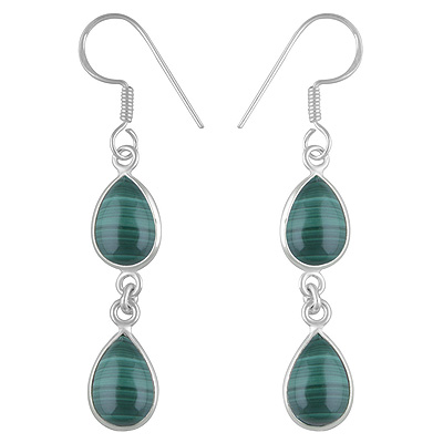 Home | Silver Earrings | Cabochon Earrings | Beautiful Two Stone Bezel Malachite Pear Shape 925 Sterling Solid Silver Dangle Earrings
