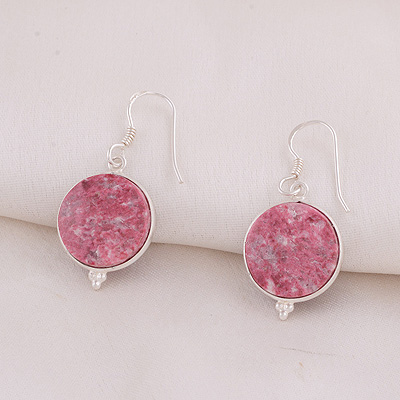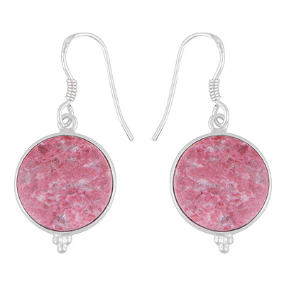 Home | Silver Earrings | Cabochon Earrings | Gorgeous Rawa Work at Bottom Bezel Thulite Round Shape 925 Sterling Solid Silver Dangle Earrings