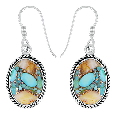 Beautiful Twisted Wire Work Around Oyster Copper Turquoise Oval Shape 925 Sterling Solid Silver Dangle Earrings