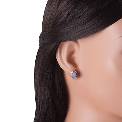 Home | Silver Earrings | Cabochon Stone Studs | Gorgeous Textured Wire Around Rainbow Moonstone Pear Shape 925 Sterling Solid Silver Stud Earrings