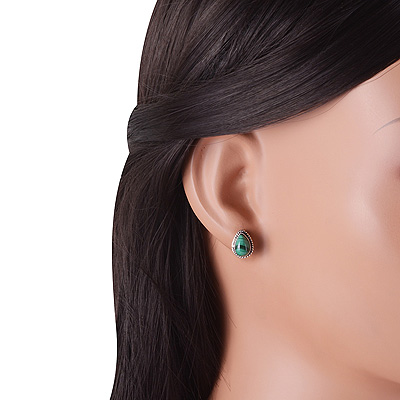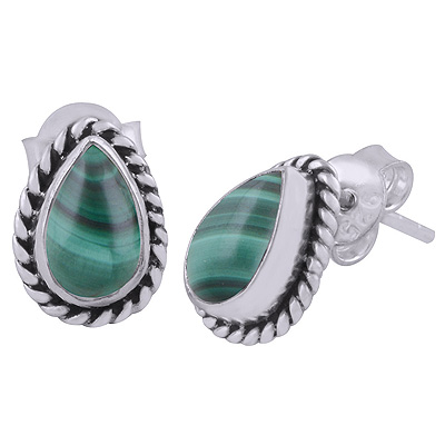 Home | Silver Earrings | Cabochon Stone Studs | Gorgeous Textured Wire Around Malachite Pear Shape 925 Sterling Solid Silver Stud Earrings