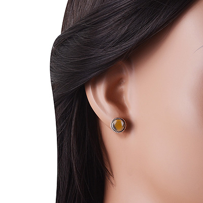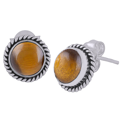 Home | Silver Earrings | Cabochon Stone Studs | Gorgeous Twisted Wire Work Around Tiger's Eye Round Shape 925 Sterling Solid Silver Stud Earrings