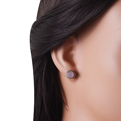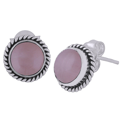 Home | Silver Earrings | Cabochon Stone Studs | Gorgeous Twisted Wire Work Around Rose Quartz Round Shape 925 Sterling Solid Silver Stud Earrings