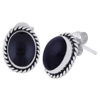 Home | Silver Earrings | Cabochon Stone Studs | Authentic Wire Work Around Black Onyx Oval Shape 925 Sterling Solid Silver Stud Earrings