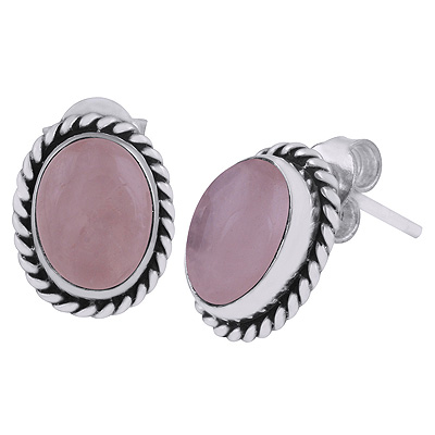 Home | Silver Earrings | Cabochon Stone Studs | Authentic Wire Work Around Rose Quartz Oval Shape 925 Sterling Solid Silver Stud Earrings