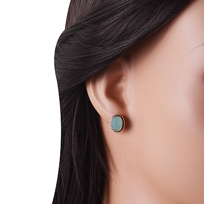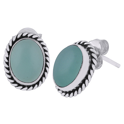 Home | Silver Earrings | Cabochon Stone Studs | Authentic Wire Work Around Aqua Chalcedony Oval Shape 925 Sterling Solid Silver Stud Earrings