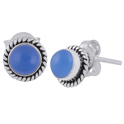 Home | Silver Earrings | Cabochon Stone Studs | Authentic Wire Work Around Blue Chalcedony Round Shape 925 Sterling Solid Silver Studs Earrings