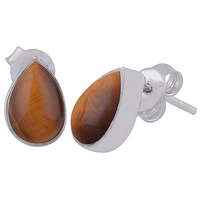 Home | Silver Earrings | Cabochon Stone Studs | Plain Collet Natural Tiger's Eye Pear Shape 925 Sterling Solid Silver Stud Earrings