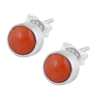 Home | Silver Earrings | Cabochon Stone Studs | Plain Collet Natural Coral Round Shape 925 Sterling Solid Silver Studs Earrings
