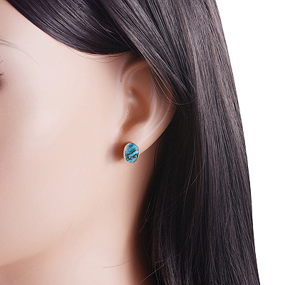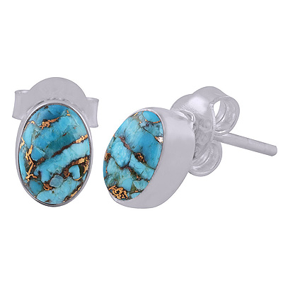 Beautiful Plain Collet Blue Copper Turquoise Oval Shape 925 Sterling Solid Silver Studs Earrings
