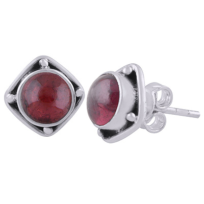 Home | Silver Earrings | Cabochon Stone Studs | Alluring Oxidised Work Around Garnet Round Shape 925 Sterling Solid Silver Stud Earrings