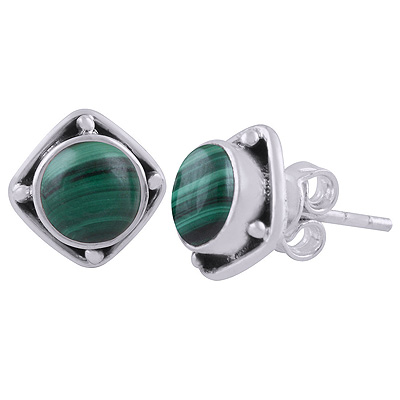 Home | Silver Earrings | Cabochon Stone Studs | Alluring Oxidised Work Around Malachite Round Shape 925 Sterling Solid Silver Stud Earrings
