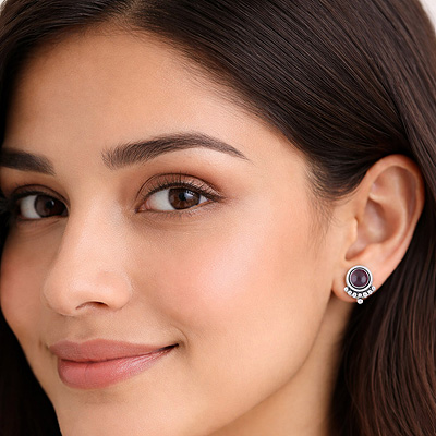 Home | Silver Earrings | Cabochon Stone Studs | Beautiful Rawa Work at Bottom Garnet Round Shape 925 Sterling Solid Silver Stud Earrings