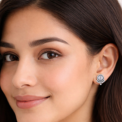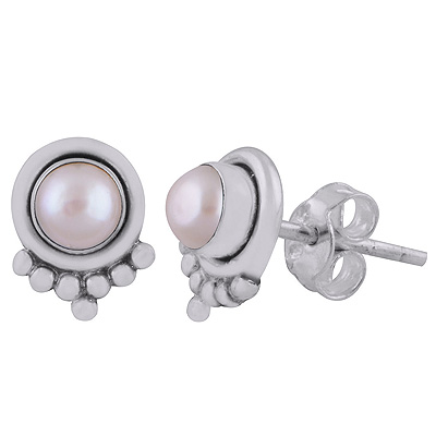 Home | Silver Earrings | Cabochon Stone Studs | Beautiful Rawa Work at Bottom Pearl Round Shape 925 Sterling Solid Silver Stud Earrings