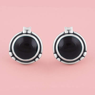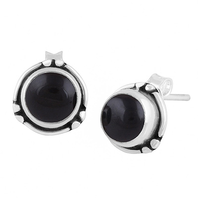 Home | Silver Earrings | Cabochon Stone Studs | Minimal Rawa & Wire Work Around Black Onyx Round Shape 925 Sterling Solid Silver Stud Earrings