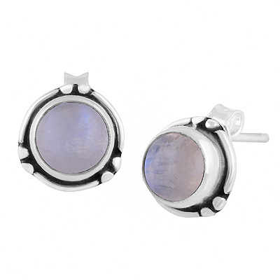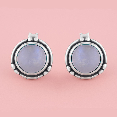 Home | Silver Earrings | Cabochon Stone Studs | Minimal Rawa & Wire Work Around Rainbow Moonstone Round Shape 925 Sterling Solid Silver Stud Earrings