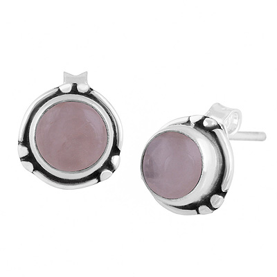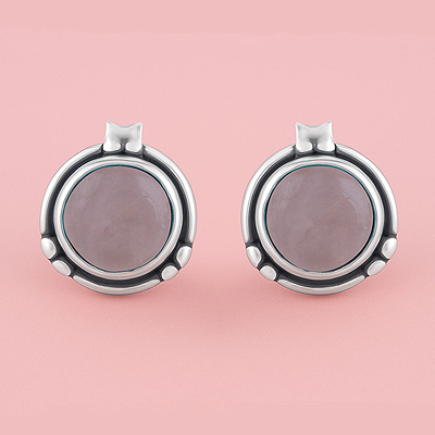 Home | Silver Earrings | Cabochon Stone Studs | Minimal Rawa & Wire Work Around Rose Quartz Round Shape 925 Sterling Solid Silver Stud Earrings