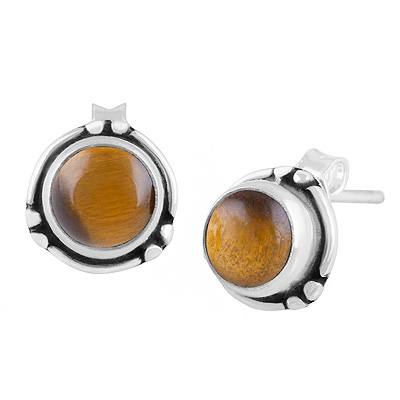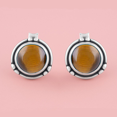 Home | Silver Earrings | Cabochon Stone Studs | Minimal Rawa & Wire Work Around Tiger's Eye Round Shape 925 Sterling Solid Silver Stud Earrings