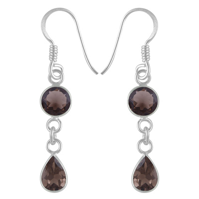 Home | Silver Earrings | Cut Stone Earrings | Gorgeous Two Stone Bezel Smoky Topaz Round,Pear Shape 925 Sterling Solid Silver Dangle Earrings