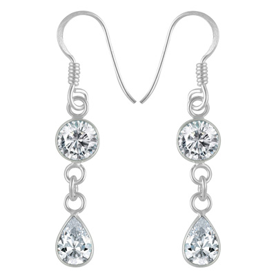 Gorgeous Two Stone Bezel White Cubic Zirconia Round,Pear Shape 925 Sterling Solid Silver Dangle Earrings