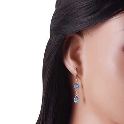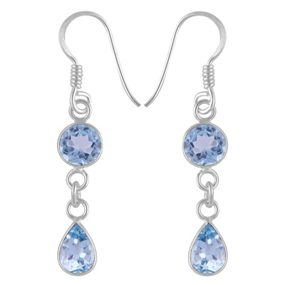 Home | Silver Earrings | Cut Stone Earrings | Gorgeous Two Stone Bezel Blue Topaz Round,Pear Shape 925 Sterling Solid Silver Dangle Earrings
