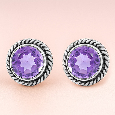 Home | Silver Earrings | cut stone studs | Gorgeous Twisted Wire Work Around Amethyst Round Shape 925 Sterling Solid Silver Stud Earrings