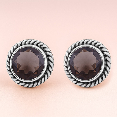 Home | Silver Earrings | cut stone studs | Gorgeous Twisted Wire Work Around Smoky Topaz Round Shape 925 Sterling Solid Silver Stud Earrings