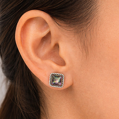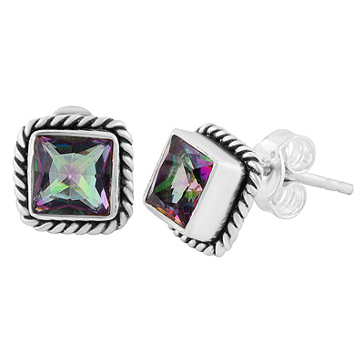 Authentic Wire Work Around Mystic Topaz Square Shape 925 Sterling Solid Silver Studs Earrings