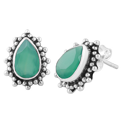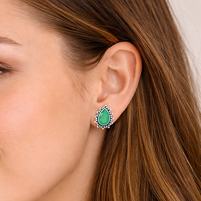 Beautifully Handcrafted Loaded With Rawa Work Around Green Onyx Pear Shape 925 Sterling Solid Silver Stud Earrings