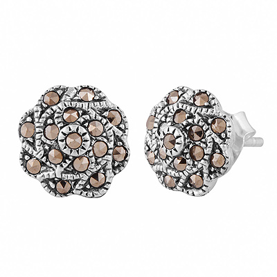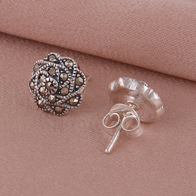 Home | Silver Earrings | cut stone studs | Alluring Studded w/ Gemstone Marcasite Round Shape 925 Sterling Solid Silver Studs Earrings