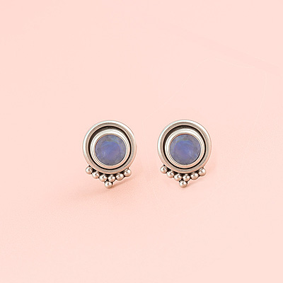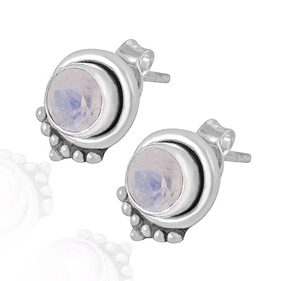 Home | Silver Earrings | cut stone studs | Stunning Rawa Work Around Rainbow Moonstone Round Shape 925 Sterling Solid Silver Studs Earrings