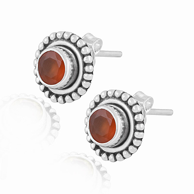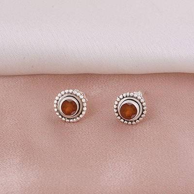 Gorgeous Oxidised Rawa Work Around Carnelian Round Shape 925 Sterling Solid Silver Studs Earrings