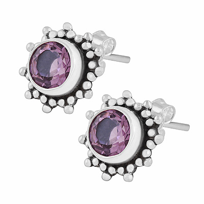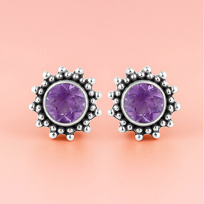 Home | Silver Earrings | cut stone studs | Gorgeous Rawa Work Pattern Around Amethyst Round Shape 925 Sterling Solid Silver Stud Earrings