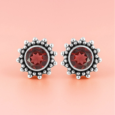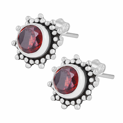 Home | Silver Earrings | cut stone studs | Gorgeous Rawa Work Pattern Around Garnet Round Shape 925 Sterling Solid Silver Stud Earrings