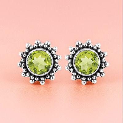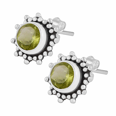 Home | Silver Earrings | cut stone studs | Gorgeous Rawa Work Pattern Around Peridot Round Shape 925 Sterling Solid Silver Stud Earrings
