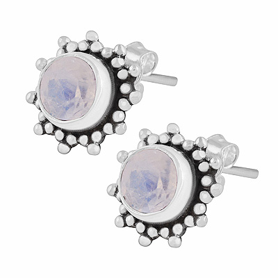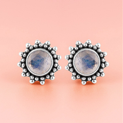 Home | Silver Earrings | cut stone studs | Gorgeous Rawa Work Pattern Around Rainbow Moonstone Round Shape 925 Sterling Solid Silver Stud Earrings