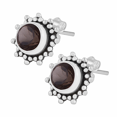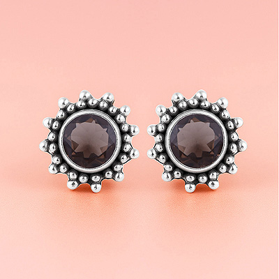 Home | Silver Earrings | cut stone studs | Gorgeous Rawa Work Pattern Around Smoky Topaz Round Shape 925 Sterling Solid Silver Stud Earrings