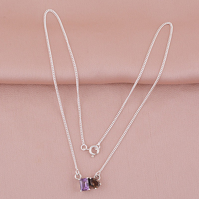 Gorgeous Birthstone Two Shaped Gemstone Amethyst,Smoky Topaz Rectangle,Pear Shape 925 Sterling Solid Silver Necklace