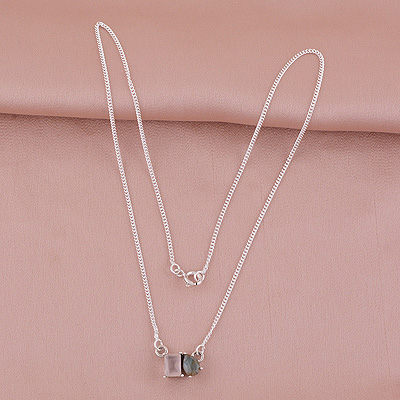 Gorgeous Birthstone Two Shaped Gemstone Rose Quartz,Labradorite Rectangle,Pear Shape 925 Sterling Solid Silver Necklace