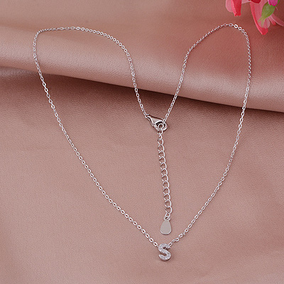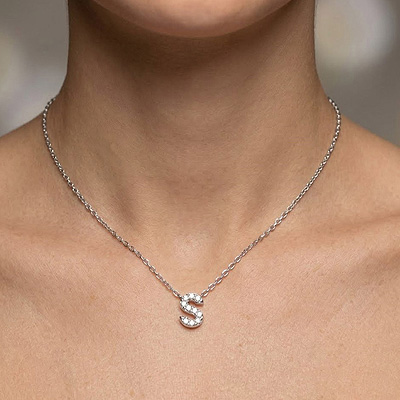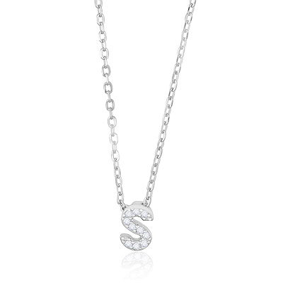 S Initial Studded Gemstone White Cubic Zirconia Round Shape 925 Sterling Solid Silver Necklace