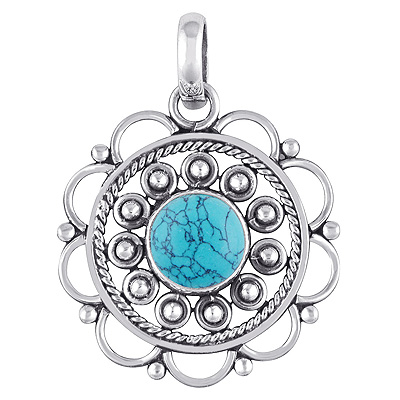 Home | Silver Pendants | Cabochon Pendants | Alluring Handcrafted Twisted Wire Work Flower Turquoise Round Shape 925 Sterling Solid Silver Pendant