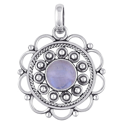 Home | Silver Pendants | Cabochon Pendants | Alluring Handcrafted Twisted Wire Work Flower Rainbow Moonstone Round Shape 925 Sterling Solid Silver Pendant