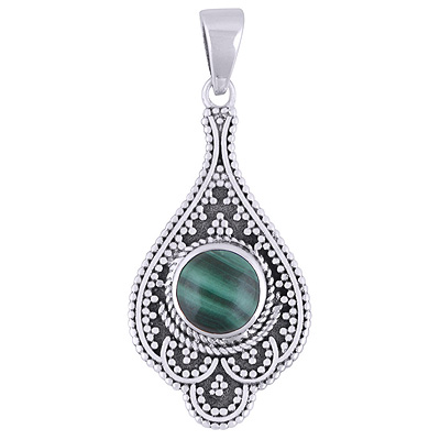 Home | Silver Pendants | Cabochon Pendants | Alluring Rawa Work Around Malachite Round Shape 925 Sterling Solid Silver Pendant