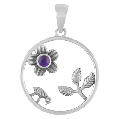 Home | Silver Pendants | Cabochon Pendants | Gorgeous Handcrafted Nature-Themed Amethyst Round Shape 925 Sterling Solid Silver Pendant