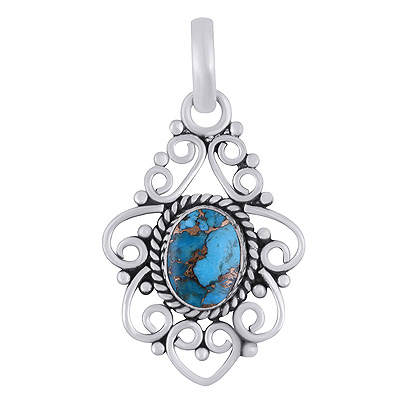 Stunning Wire Pattern & Rawa Work Around Blue Copper Turquoise Oval Shape 925 Sterling Solid Silver Pendant