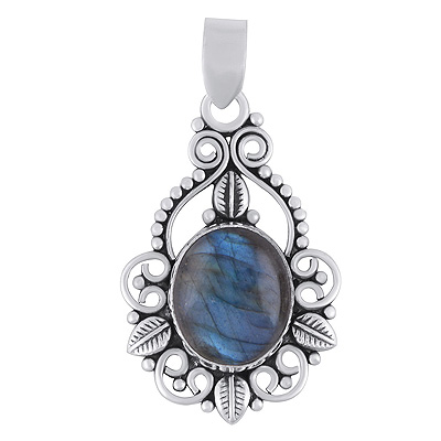 Home | Silver Pendants | Cabochon Pendants | Beautiful Leaf Pattern & Rawa Work Around Labradorite Oval Shape 925 Sterling Solid Silver Pendants