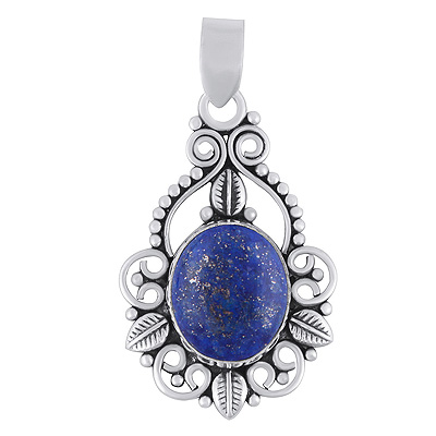 Home | Silver Pendants | Cabochon Pendants | Beautiful Leaf Pattern & Rawa Work Around Lapis Oval Shape 925 Sterling Solid Silver Pendants