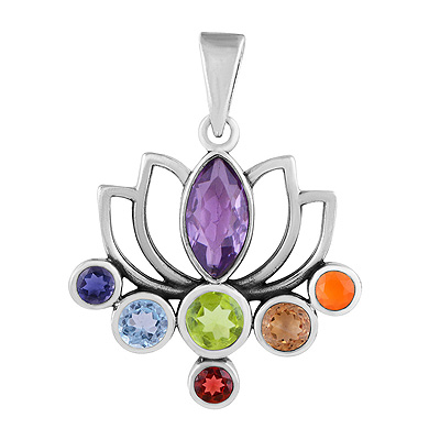 Beautifully Flowar Chakra Gemstone Around Amethyst,Iolite,Blue Topaz,Peridot,Citrine,Carnelian,Garnet Multi Shape 925 Sterling Solid Silver Pendant